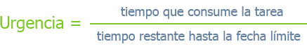 La urgencia de una tarea es una cualidad asociada al tiempo para llevarla a cabo. Aumenta a medida que el tiempo restante para la fecha de entrega se acerca a cero, así como con el tamaño de la tarea.
